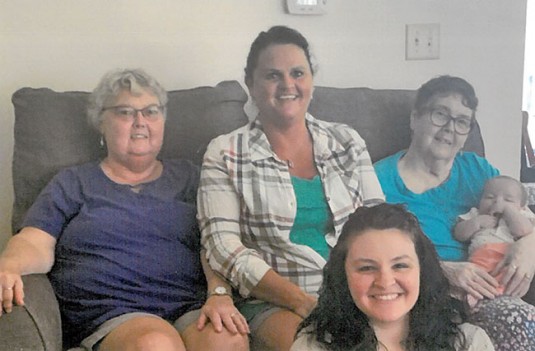 Five generations Posted on August 25, 2021 0 The birth of Leighla Barnett makes five generations of this Kenton family. Pictured are (front) mom Alexis Evans; (from left, back) Great-Grandmother Judy Hastings, Grandmother Wendy Evans and Great-Great-Grandmother Helen Robinson, who is holding Leighla.