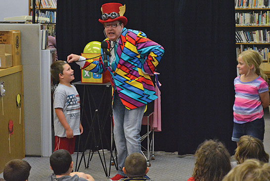 Math powers ‘Captain Numbers’ performs a math trick as Cody Thiel and Anne-Marie Minter assist during his super hero math show at the Hardin Northern Public Library’s summer reading program on Tuesday. Read More