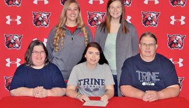 Playing at Trine Kenton High School senior Kelsey Flowers (front, center) signed a letter of intent on Wednesday morning to continue her education and play tennis at Trine University in Indiana. Read More