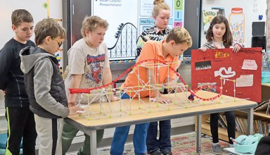Designing roller coasters Hardin Northern fourth graders have been working on their engineering skills. They have put together their knowledge of energy and the engineering design process to build roller coasters. They designed, tested, and improved their roller coaster until it was functional. This week they presented their final products to the class, and explained how energy and forces made their roller coaster successful. … Read More