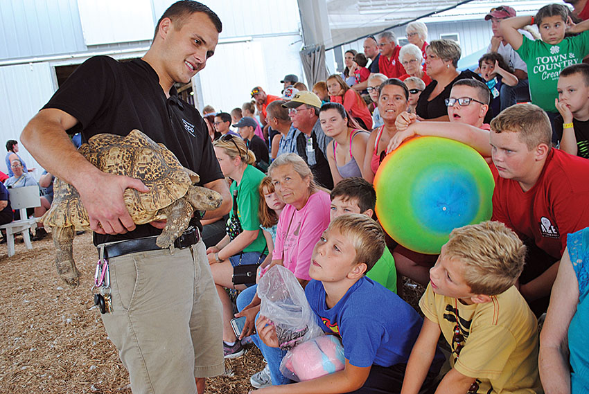 Close look Posted on September 8, 2018 0 Times photo/Dan Robinson Guests were given a close look at the Leopard Tortoise from the Columbus Zoo at a program Friday afternoon at the Hardin County Fair. The zoo crew brought a penguin, leopard and other animals from their zoo collection. The display was popular with guests who filled the bleachers of the small show arena.