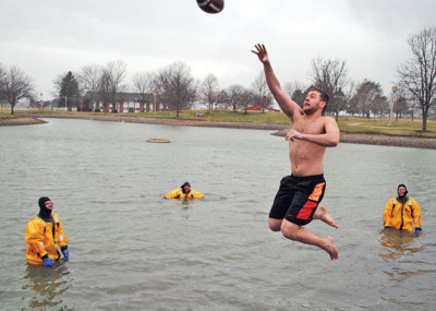 One-handed catch Posted on February 27, 2017 0 Ohio Northern University student Devin Pennington makes a one-handed catch of a football thrown by a companion as he plunges into the chilly waters of a pond on the ONU campus on Saturday morning. The leap was part of the annual Polar Bear Plunge sponsored by the Delta Sigma Phi fraternity to raise money for the American Red Cross. Normally, the student plunge into a hole in the ice, but the high temperatures changed those plans for this year’s event. Times photo/Dan Robinson