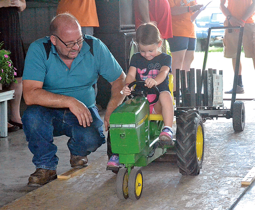 Bob Fish encourages young Analei Kellermeyer during the kiddie tractor pull competition on Tuesday.