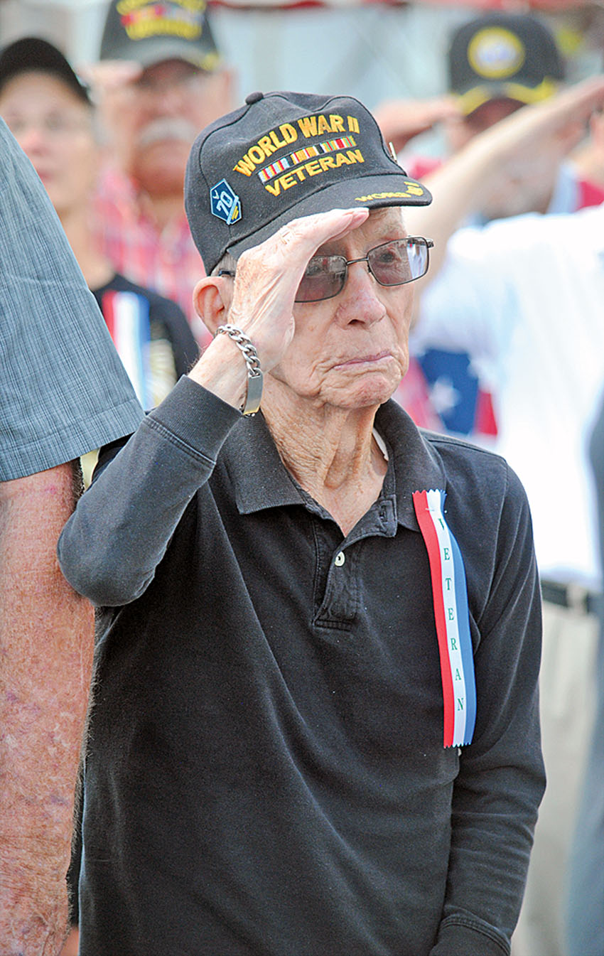 World War II veteran Lester Johns leads the veterans who attended Tuesday’s opening ceremony of the Hardin County Fair in a salute to the flag as the national anthem was played.