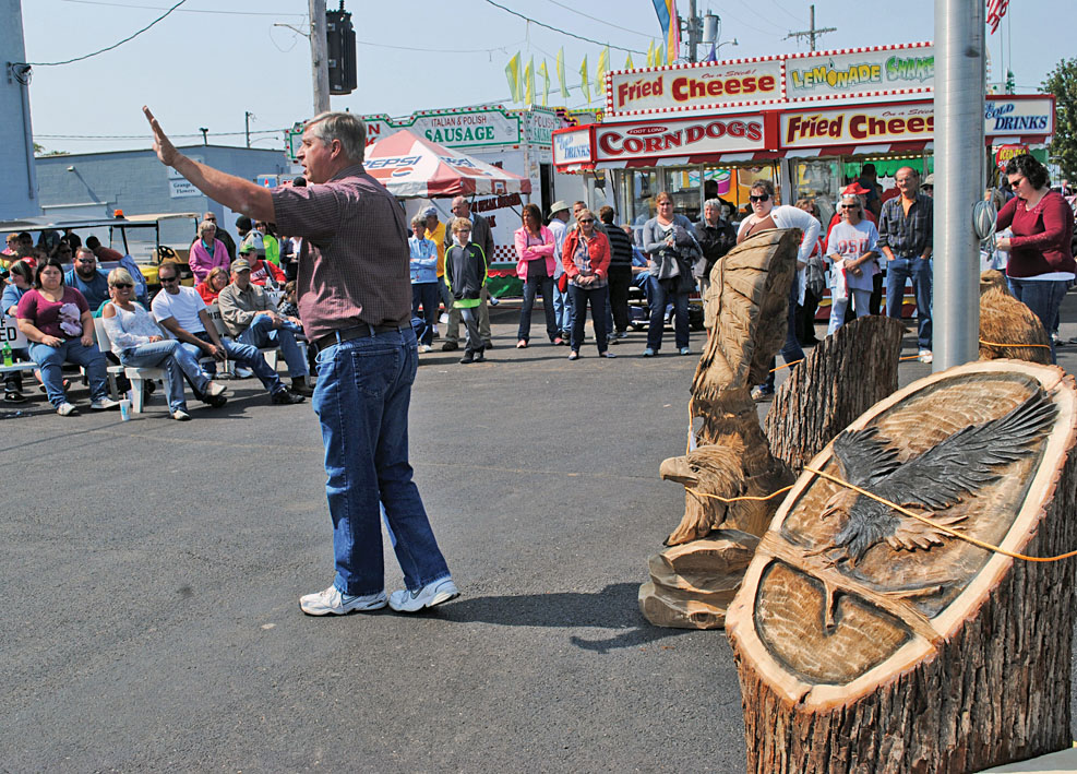 Sculpture auction Posted on September 11, 2017 0 Times photos/Dan Robinson Several bidders were on hand Sunday afternoon to seek one of the wooden sculptures created by Brandon Adams of Bear Hollow Wood Carvers. Adams uses a chain saw to cut the forms out of a log. The prices paid for the art pieces went as high as $1,050 for the Native American piece.