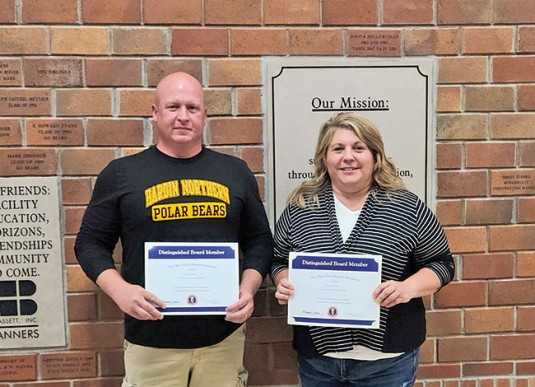 Service awards Posted on June 28, 2023 0 Longtime board members Kenny Hopson (left) and Michelle Obenour received Distinguished Board Member awards from The Ohio School Boards Association at the Hardin Northern Board of Education meeting on Tuesday night. Obenour has been on the board for 20 years and Hopson has served a decade. Times photo/Sean Blevins