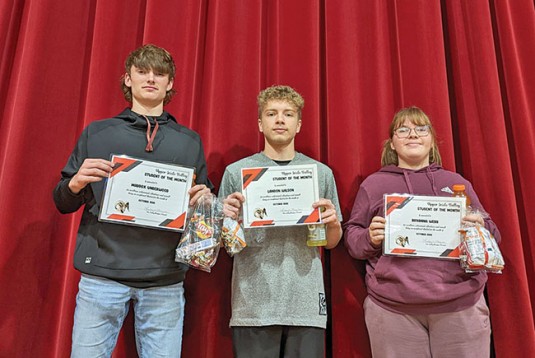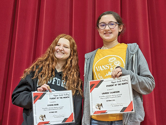 USV cheers sports success Posted on November 16, 2022 0 By JOEL McCULLOUGH Elementary honoreesUSV Elementary school students of the month for October are (from left, front row) Caidy Clem (kindergarten), Angely Cazares-Vargas (2nd), Julianna Mizek (1st), Ayden Piehl (2nd), Amanda Jenkins (kindergarten); (back row) Hailey Bailey (4th), Izabella Bailey (5th), Alexa Kearns (6th), Adilynn Thompson (5th), Macoy Underwood (6th) and Chandler Budwit (5th). Also pictured is Paul Ralston, USV school board president. Not pictured is Brody Stedmen (2nd) and Paisley Newport (3rd).Times photo/Joel McCullough Times staff writer McGUFFEY — Although she is soft spoken, Upper Scioto Valley’s Lindsey Thompson, 7-12 principal, made it clear that she speaks for everyone in saying that they are very proud of the fall sports teams and the great season they had this year. This included senior cross country runner Joe Parker. She said that they were all very proud that for the second consecutive year Parker has earned the Academic All-Ohio award. Parker made it to the state level in cross country while maintaining a 3.5 (or higher) grade point average. “We are proud of all the sports teams, especially Joe for making it all the way to state and carrying such a high grade point average,” said Paul Ralston, school board president. Monday night’s school board meeting kicked off with open discussion. Classified employees were in attendance to discuss the recent negotiations they had regarding their contracts. They expressed their dislike for the change in policy for sick leave accumulation. They also expressed that they felt they were not properly informed. Junior high recognitionUpper Scioto Valley Junior High students of the month for October are (from left) 7th grader A’Raya Boyd and 8th grader Lauren Thompson. Board President Paul Ralston stated that they had received the details of the negotiation and that the policy and calculation is now the same as teachers and the rest of the school staff. Drew Snow, information technologies supervisor, explained updates to the students’ Chromebooks, the new camera server installed in August, possible new cameras in blind spots, and cyber security. Sara Core, K-6 principal, said that a theme they drove in October was accountability. She touched on safety lessons, homework help, an ONU partnership and the science fair approaching in December. In-between principals, Alexis Krummrey, reported sixth grade math and science classes gave a demonstration of the projects and programs they have been working on the past month. Thompson brought up the school attendance issue with upper class students. She said they are trying anything they can, including incentives, to try to get the rates higher. Superintendent Craig Hurley said he is looking into grants available for updating the school’s sound system. The estimated cost is $125,000. Hurley added that Hubble Arts is working on re-branding the USV “U” logo. High school honorsUpper Scioto Valley High School students of the month for October are (from left) sophomore Maddox Underwood, freshman Landon Wilson and junior Bryanna Webb. Not pictured is senior Kevin Smith. The board approved: – The superintendent’s first readings of revised policies. – Mileage expense for the transportation of band equipment to athletic events for Melissa Decker and Melanie Dyer. – The salary change of Alexis Krummrey for additional college credit hours. That will place her on BA+150 pay scale. – The estimate with Krummrey Lawn Services, LLC for $27,220 for all lawn care as presented. – The authorization for the treasurer to place $10,000 to cover athletic officials and security officers for the current school year. – The estimate from Kent Williams Drainage totaling $138,457. The main portion of this estimate was for the 95,000-foot pipe that was installed for $91,200. The board meeting ended with a closed session to discuss compensation for an employee. No action was taken.