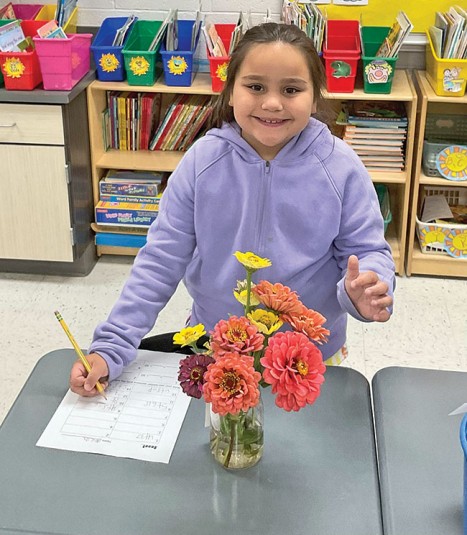 Working on math Posted on September 14, 2023 0 Mrs. Hackworth’s first grade at Hardin Northern has been learning how to write addition number sentences in math. They did a Scoot activity where they walked around the room and counted things from nature. The students, including Amelia Hernandez (pictured), wrote number sentences for the flowers, pinecones and buckeyes.