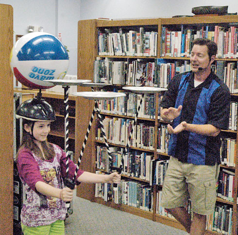 Balancing act Posted on June 15, 2016 0 Times photo/Ty Thaxton With the help of professional juggler Matt Jergens, Emma Staples balances four plates and a beach ball all at once. The feat was a part of Jergens’ act during the summer reading program Tuesday at the Hardin Northern Public Library in Dunkirk.