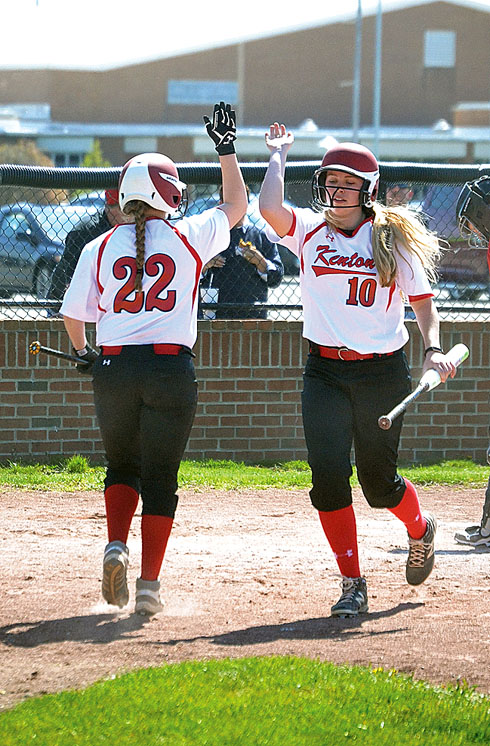 Celebrating the run Posted on April 18, 2016 0 Times photo/Kurt Ritzman Kenton’s Jenna Rodenberger (10) slaps hands with Alivia Purtee after scoring the put the Wildcats ahead 5-0 in the third inning of Game 1 of a doubleheader against Bellefontaine on Saturday. Kenton won 5-1 and 10-2 to grab the sweep.