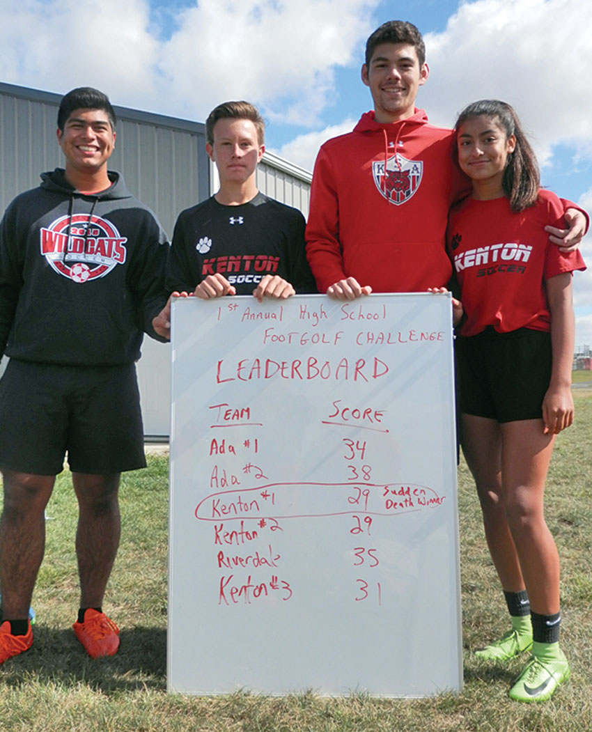 Foot golf winner Posted on October 4, 2017 0 The winning team in the first annual High School Foot Golf Challenge held at Corner Kicks Soccer Complex was the Kenton team of (from left) Isaac Mendez, Hunter LaRue, Erick Mendez and Jazmine Mendez. Submitted photo