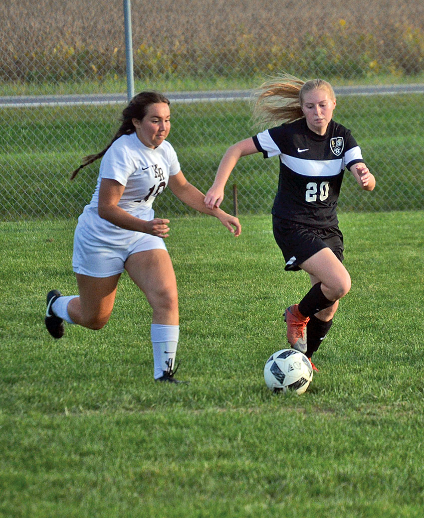 Ben Logan’s Casey Farmer (right) and a Kenton Ridge player run after the ball during the Raiders game against Kenton Ridge on Monday night.