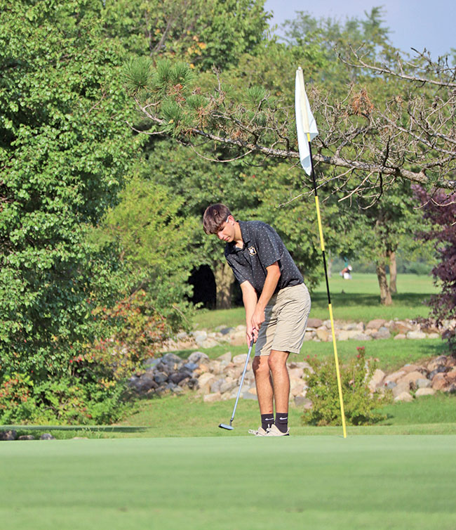 Ridgemont’s Manns medals with 44 in win over Hardin Northern Posted on August 23, 2023 0 Good formHardin Northern senior Sean Kuhlman shows his good putting form in Monday’s boys golf match against Ridgemont at Colonial Golf Course in Harrod. HARROD — Dawson Manns medaled with a 44 and helped the Ridgemont boys golf team to a 194-225 victory over Hardin Northern Monday at Colonial Golf Course in Harrod. Hardin Northern’s Preston Grappy and Justin Thiel both shot 47s to tie for second individually. Cody Thiel carded a 61, Sean Kuhlman a 70 and Xavier Emirine a 73. Ridgemont’s Will Browning was third individually with a 46. Devan Ramsey shot a 50. Harrison Reppart had a 54. Hayden Shoffner contributed a 56 and Ethan Moore a 60. Hardin Northern plays McComb today at Colonial Golf Course in Harrod at 4:30 p.m. Ridgemont plays Ridgedale today at 4:30 p.m. at Veterans Memorial Park Golf Course in Kenton. Team results Ridgemont 194, 2. Hardin Northern 225. Individual results Ridgemont: Manns 44, Browning 46, Ramsey 50, Reppart 54, Shoffner 56, Moore 60. Hardin Northern: Grappy 47, Justin Thiel 47, Cody Thiel 61, Kuhlman 70, Emerine 73. Medalist: Dawson Manns (RM) 44.