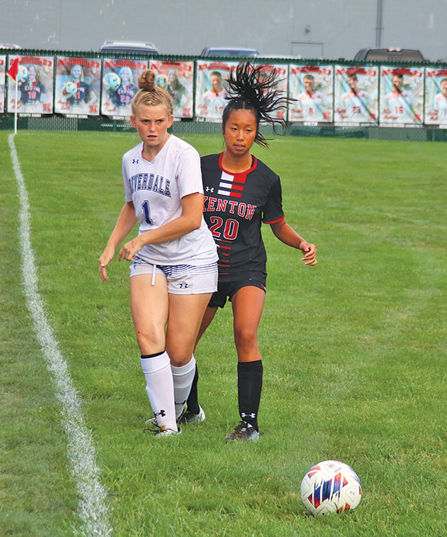 Wetherill’s strike sends Lady ‘Cats over Falcons Posted on September 6, 2022 0 PassingRiverdale senior Maddie Biltoft (1) sends a pass to a teammate close to the sideline as she felt the pressure from Kenton sophomore Chloe Hattery (20) during Saturday’s Hardin County Showdown, which the Wildcats won 2-0.Times photo/Sean Blevins By SEAN BLEVINS Times sports editor The Kenton girls soccer team scored early and held Riverdale scoreless the whole way en route to a 2-0 home win in Saturday’s showdown of soccer rivals. The Wildcats got on the board in the eighth minute after Abi Temple won the ball back from a defender, then passed it to Ali Harpel who layed it off for Gabi Wetherill to blast a 30-yard screamer over the goalkeeper. “They didn’t want us to beat them with speed,” KHS coach Wade Wetherill said. “They didn’t let us go over top of them, so we knew we were going to have to shoot from a distance.” The Wildcats kept attacking in the first half, but the Falcons were forcing tough shots. Riverdale played a better second half than the first, but was unable to find the timely goal they needed as Kenton goalkeeper Ruby Styer wasn’t allowing anything through, finishing with five saves on the night. About 17 minutes into the second half, Kenton’s Kinze Sprang sent a long shot into the box that took an unusual bounce over the goalkeeper and in. Riverdale’s Maya Frey created several chances for herself and teammates, but Kenton’s defenders blocked some shots at opportune times to keep it at bay. “We’re doing a lot of good things but we have to piece it together,” Riverdale coach Scott Bash said about his young team. Bash said they hope to take it up a notch when league play starts for them Wednesday at Ada at 7 p.m. Kenton is back in action today at home against Bath at 7 p.m.